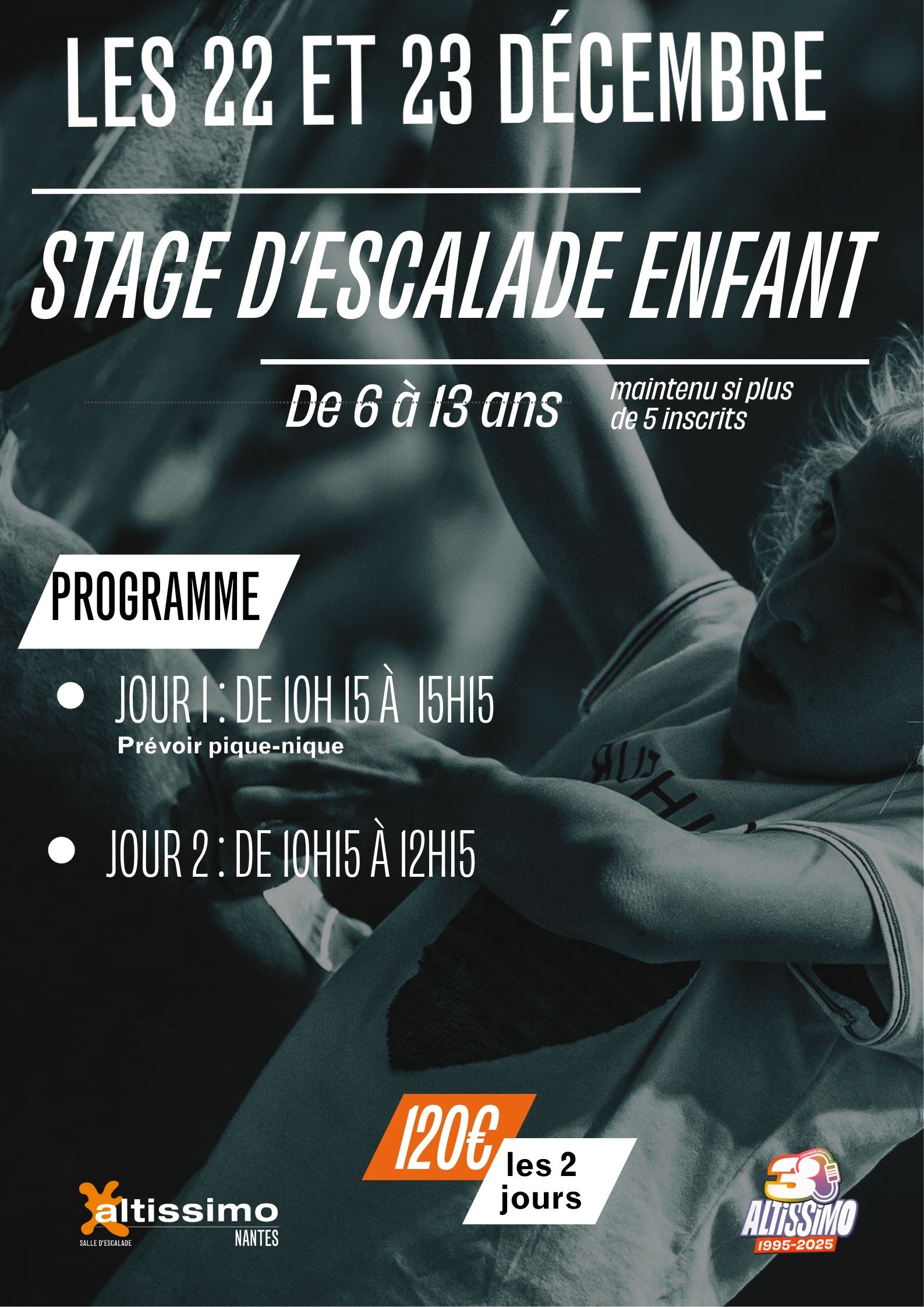 Votre salle ALTISSIMO Nantes organise un stage d’escalade d’un jour et demi pour les enfants à partir de 6 ans !